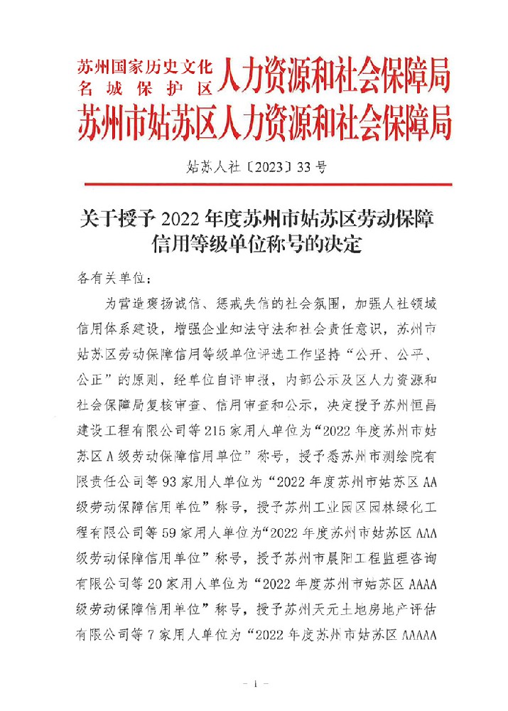 關于授予2022年度蘇州市姑蘇區(qū)勞動保障信用···